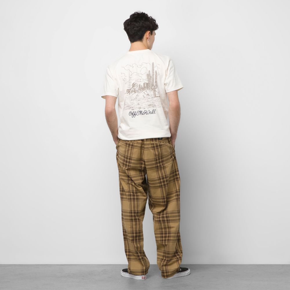 Built around an easy pull-on elastic waist for all-day, everyday wear, this versatile pant features a long rise at the waist that stays baggy through the hip and thigh, ending in a tapered leg. The cotton fabrication offers a soft hand feel, while an allover plaid print and subtle brand details keep the style on point: Drop-V bar tack embroidery at the side seam and pockets, a key loop on the right rear waistband, and a branded flag label sewn into the hem of the leg opening that’s visible when cuffed.